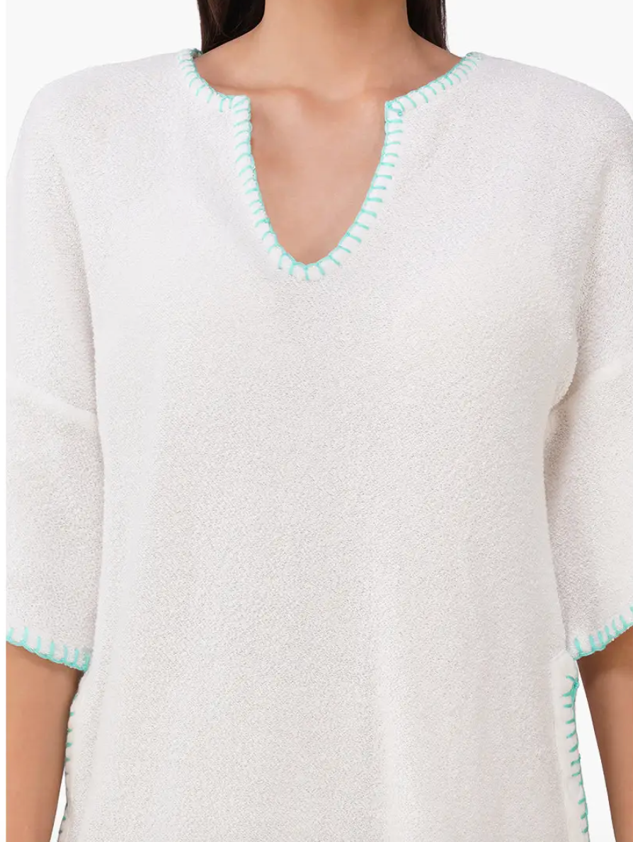- Finished with contrast blanket stitching at the neckline, hem, and side slits