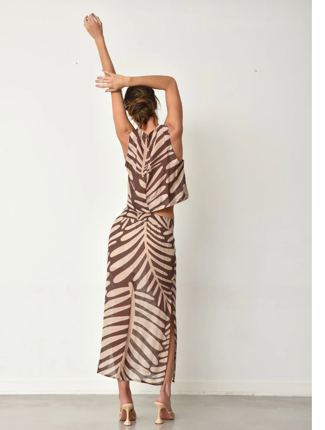 Channel your fearless nature with the Leaves maxi skirt in a mocha mousse and natural smooth print. This one-of-a-kind garment seamlessly blends romance and exploration, ensuring it's a coveted addition to your wardrobe. Complete your boho chic ensemble by pairing it with the matching top. Exude bravery and poise while maintaining comfort with a back elastic waistband and feminine design. Don't hesitate to incorporate this captivating and alluring skirt into your collection. Pairs with Leaves top