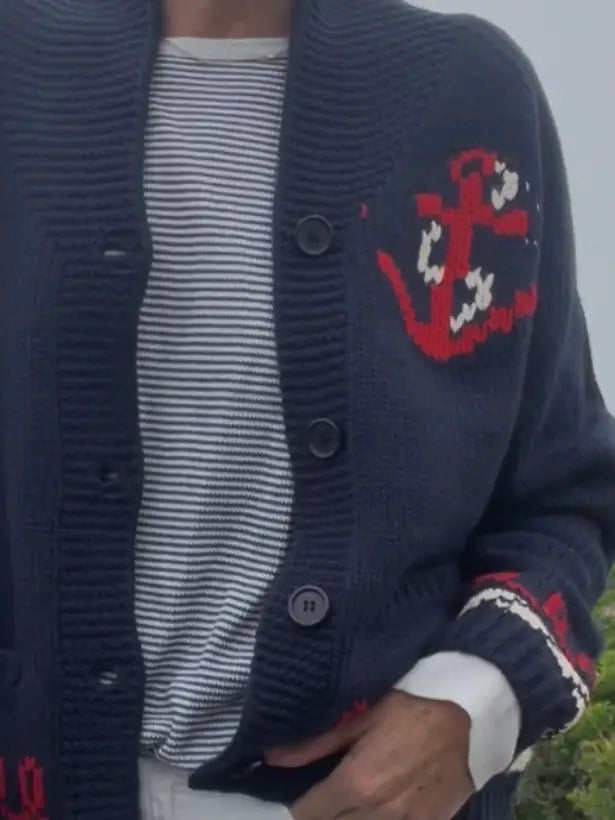 Dive into the warmth of our cozy Varsity Cardigan and make a statement at your next summer lobster bake! This snug duffle cardigan isn't just another layer; it's your best companion for those breezy seaside evenings and laid-back gatherings with loved ones. Crafted with love and care, the lobster motif on the back adds a playful touch to this classic piece, ensuring you stand out while staying toasty.
