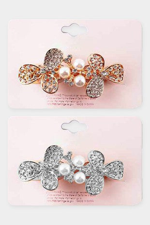 Pearl Accented Rhinestone Flower Barrettes