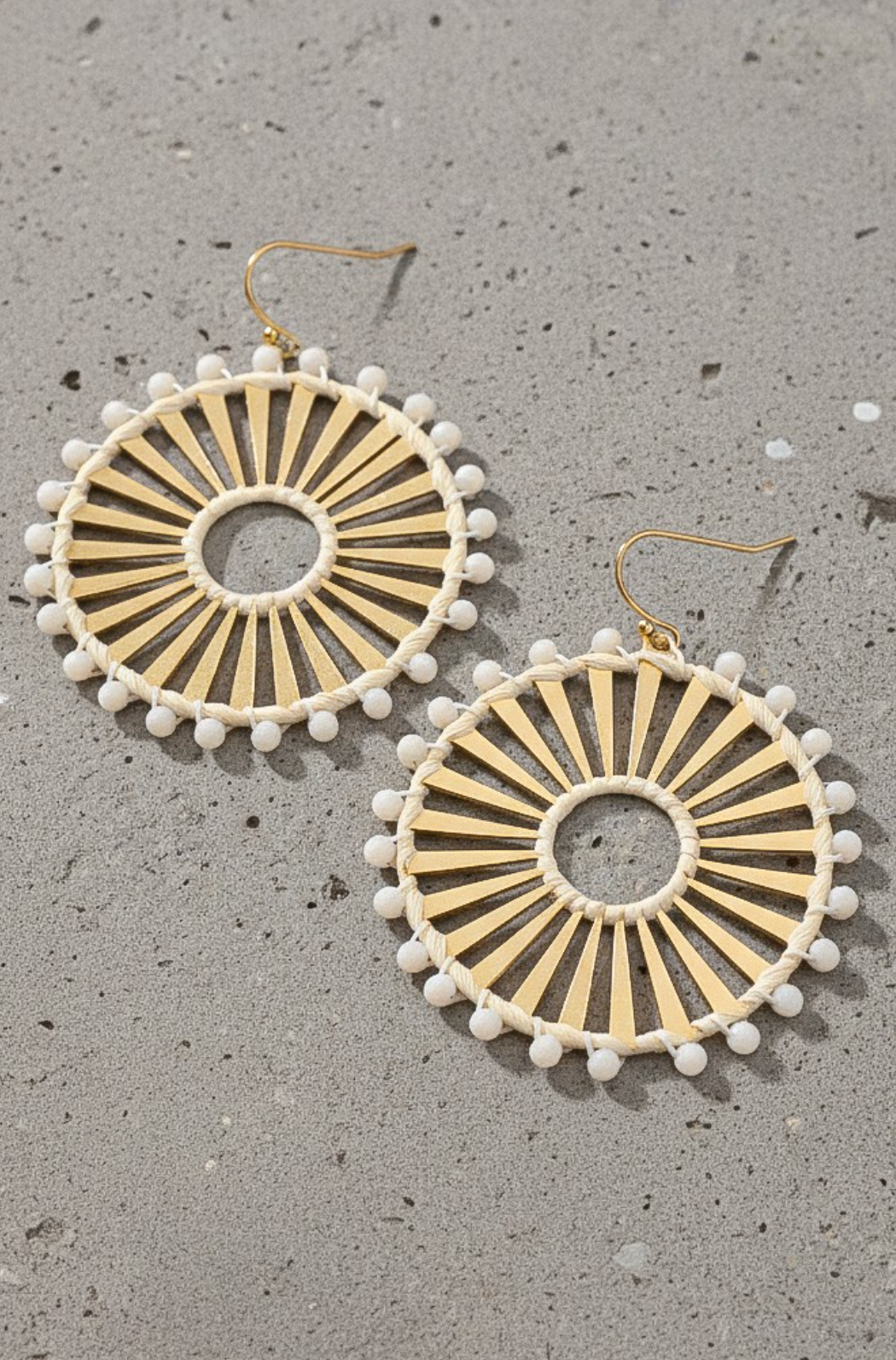 openwork solar ray disk with raffia straw wrapped in the center, and raffia straw and faceted glass bead wrapped on the outer edge