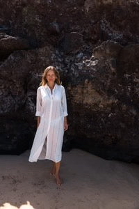 For this specific style, we recommend that you size down one size. Made in a beautiful, embroidered fabric, this Maxi Shirt Dress is the perfect oversized, classic button-down. The carefully placed buttons on the cuff and the extra length in the back prove that the Positano Maxi Shirt Dress is a cover-up you will want to wear year after year.