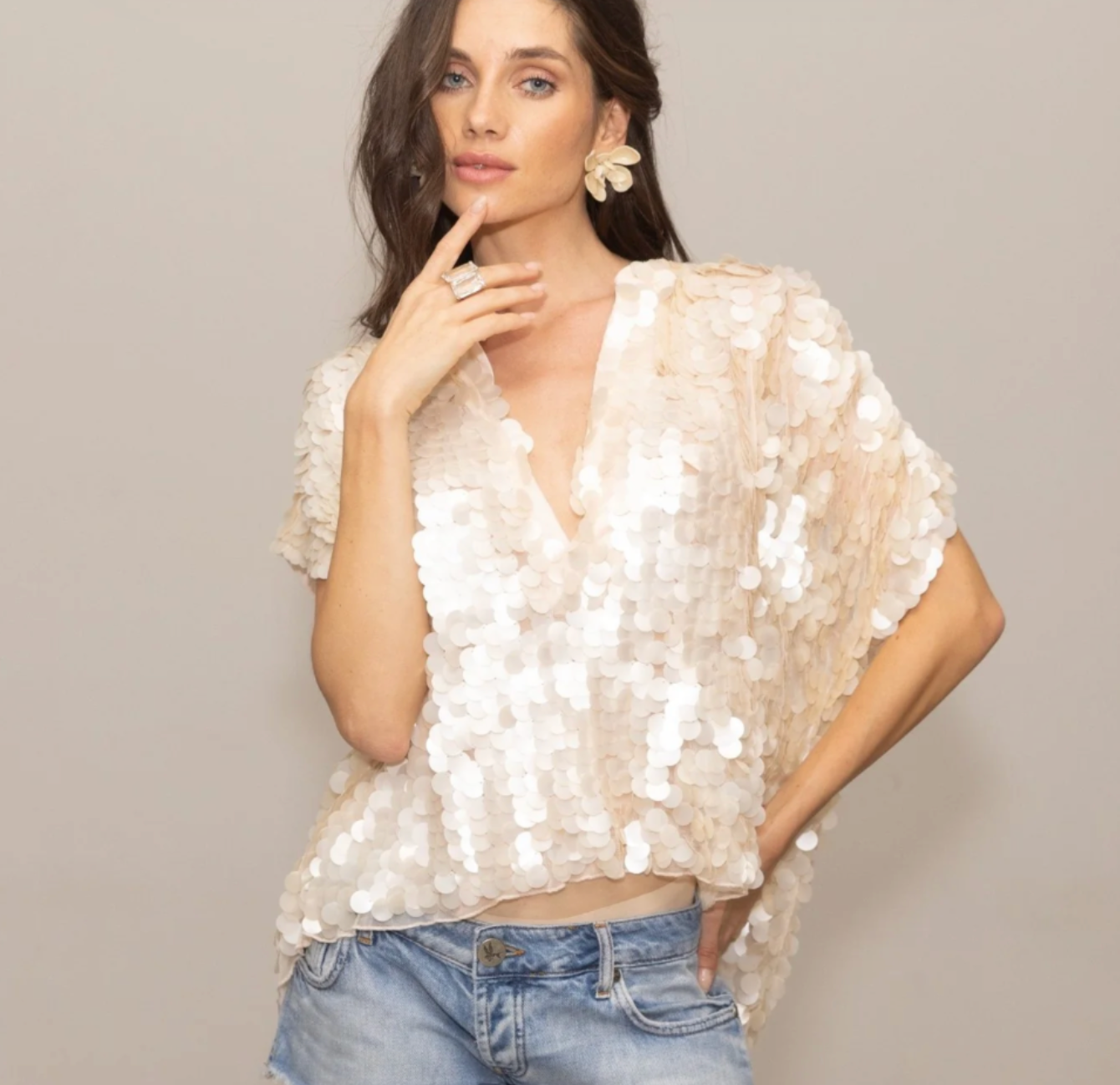 Elevate your evening look with the festive shiny Top, a refined piece that delivers understated glamour. The delicate sequin detailing catches light beautifully without overwhelming your silhouette, making it ideal for both special occasions and elevated casual wear. Style it effortlessly with a denim short, or classic denim, or tailored separates for a polished aesthetic that speaks volumes.